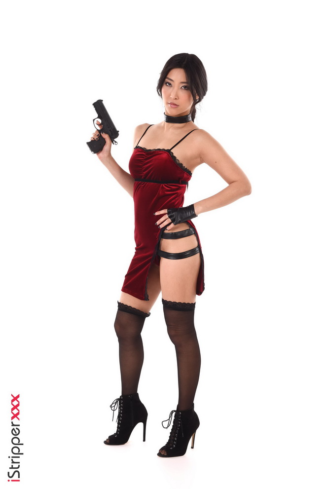 Asian seductress in a velvet dress and with a gun. Graceful erotica!